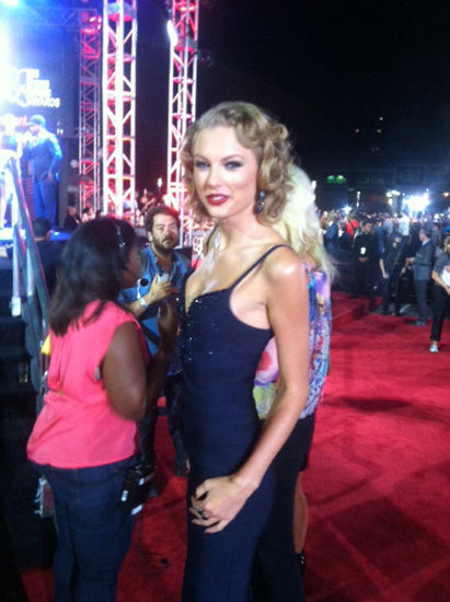 Taylor Swift is wearing a stuck-on-the-body-licious dress that is signature of designer Herve Leger. Of course she’s 11 feet tall and has the perfect body for this! Flawless pin curls make this look retro-glam.